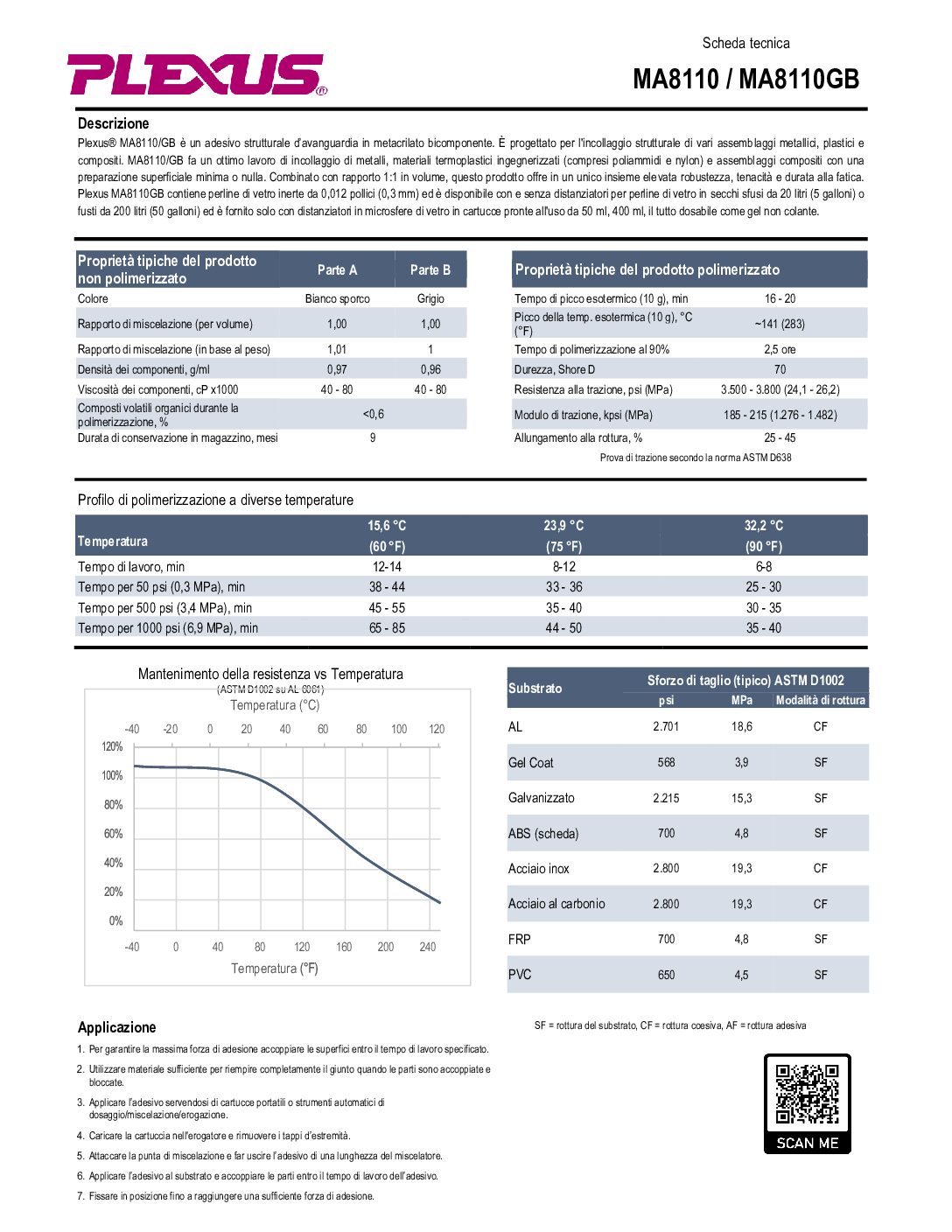 Plexus® MA8110/GB è un adesivo strutturale d’avanguardia in metacrilato bicomponente. È progettato per l’incollaggio strutturale di vari assemblaggi metallici, plastici e compositi. MA8110/GB fa un ottimo lavoro di incollaggio di metalli, materiali termoplastici ingegnerizzati (compresi poliammidi e nylon) e assemblaggi compositi con una preparazione superficiale minima o nulla. Combinato con rapporto 1:1 in volume, questo prodotto offre in un unico insieme elevata robustezza, tenacità e durata alla fatica. Plexus MA8110GB contiene perline di vetro inerte da 0,012 pollici (0,3 mm) ed è disponibile con e senza distanziatori per perline di vetro in secchi sfusi da 20 litri (5 galloni) o fusti da 200 litri (50 galloni) ed è fornito solo con distanziatori in microsfere di vetro in cartucce pronte all’uso da 50 ml, 400 ml, il tutto dosabile come gel non colante.